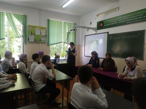 13.09.201913 сентября в 8-10 классе учителем биологии Кагировой Х.Р. был проведён эко-урок по теме «Сохраним Мир – чистым!». На это мероприятие были приглашены гости: инспектор ПДН ОУУП и ПДН ОМВД России по Сунженскому району ЧР младший лейтенант полиции Магомадова Т.Л. и руководитель молодёжной организации МОПД «АХМАТ» Ибрагимова М.Х.