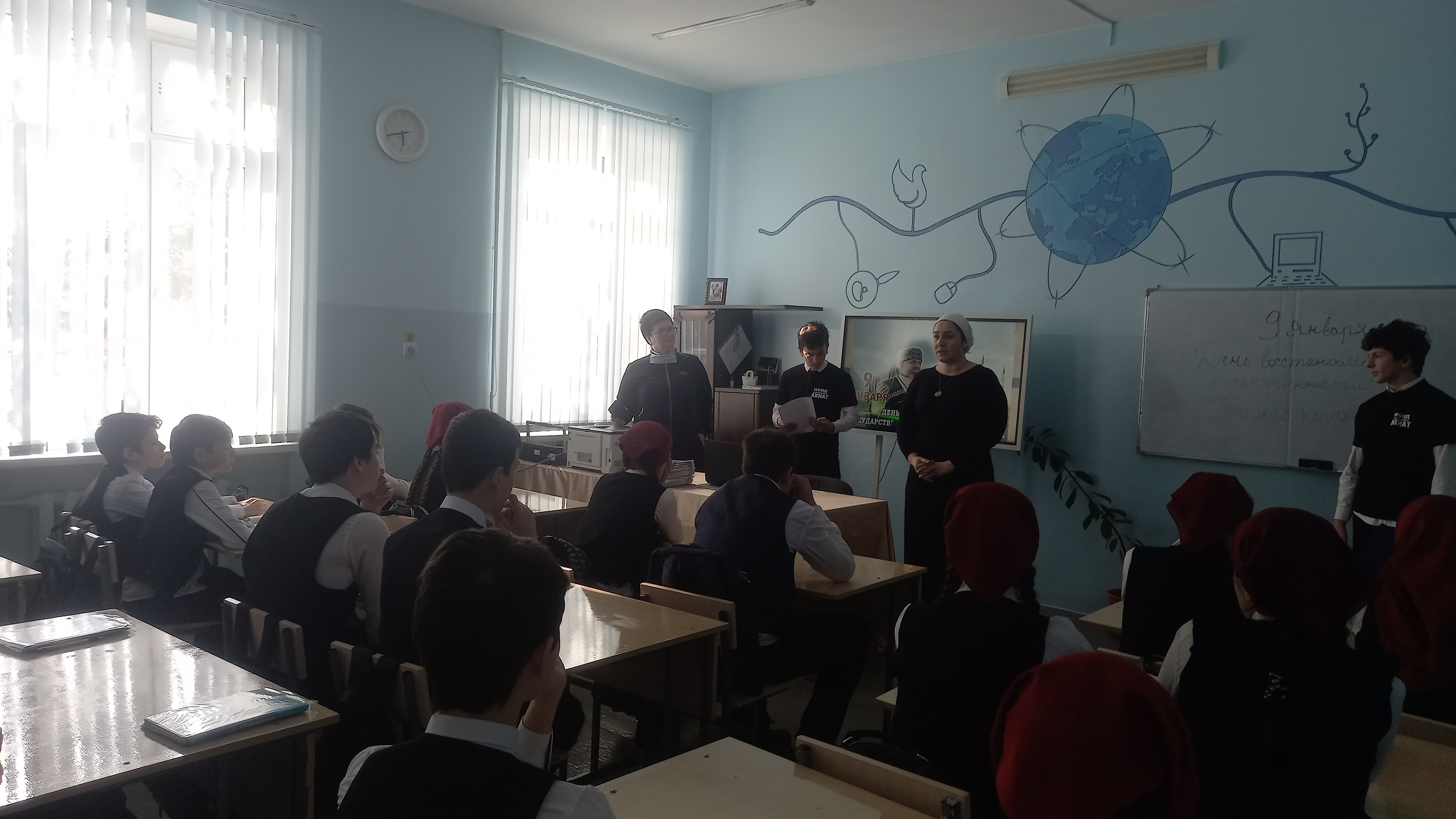 В мероприятии приняли участие учащиеся 8го класса. В качестве ведущего мероприятия выступила учитель истории и обществознания Алиханова А.Л., которая рассказала школьникам о самой трагичной странице в истории чеченского народа – депортация в Казахстан и Среднюю Азию, о том, как и когда было принято решение о восстановлении ЧИАССР, кто повлиял на торжество исторической справедливости, почему при восстановлении Чечено-Ингушской АССР в её составе остались переданные в 1944 году из Ставропольского края в Грозненская область Наурский и Шелковской районы с преобладающим русским населением, но при этом ей не был возвращён Пригородный район, оставшийся в Северной Осетии, почему чечено-ингушскому населению было запрещено проживать в прилегающих к Грузинской ССР южных горных районах республики. Выступающие обучающиеся рассказали о событиях, произошедших на территории Чеченской Республики в годы наведения конституционного порядка, как шло возрождение социально-экономической сферы, о возвращении людей на родные земли и о сегодняшней Чечне – мирной и процветающей.