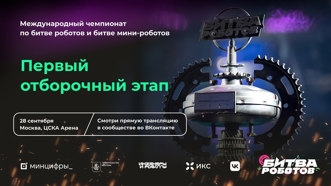 23.09.2024Первый отборочный этап второго сезона чемпионата стартует 28 сентября! На высокотехнологичном ринге в московской «ЦСКА Арене» встретятся юные специалисты и опытные инженеры, а также любители робототехники из 6 стран: России, Индии, Бразилии, Ирана, Беларуси и Китая. В категории до 110 кг выступят 32 команды, а в новой дисциплине «Битва мини-роботов» — 16. Все участники представят свои разработки в захватывающих поединках и будут бороться за выход в полуфинал! 🔗Следить за сражениями можно будет онлайн в нашем сообществе — vk.cc/cA6d8J Чемпионат проводится второй год подряд. Координацию подготовки и проведения чемпионата осуществляет Минцифры России. Первый отборочный этап чемпионата 2024 года в «ЦСКА Арене» пройдет при поддержке Правительства Москвы. Оператор чемпионата — АНО «Инженеры и роботы». Генеральный технологический партнер чемпионата — VK vk.company/ru, генеральный индустриальный партнер — ООО «ИКС Холдинг» x-holding.ru, партнер мини-битвы — Сферум prof.sferum.ru.