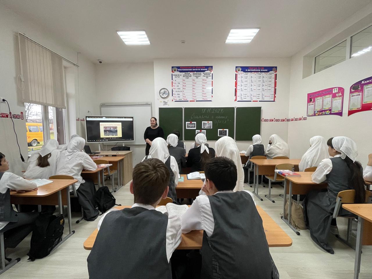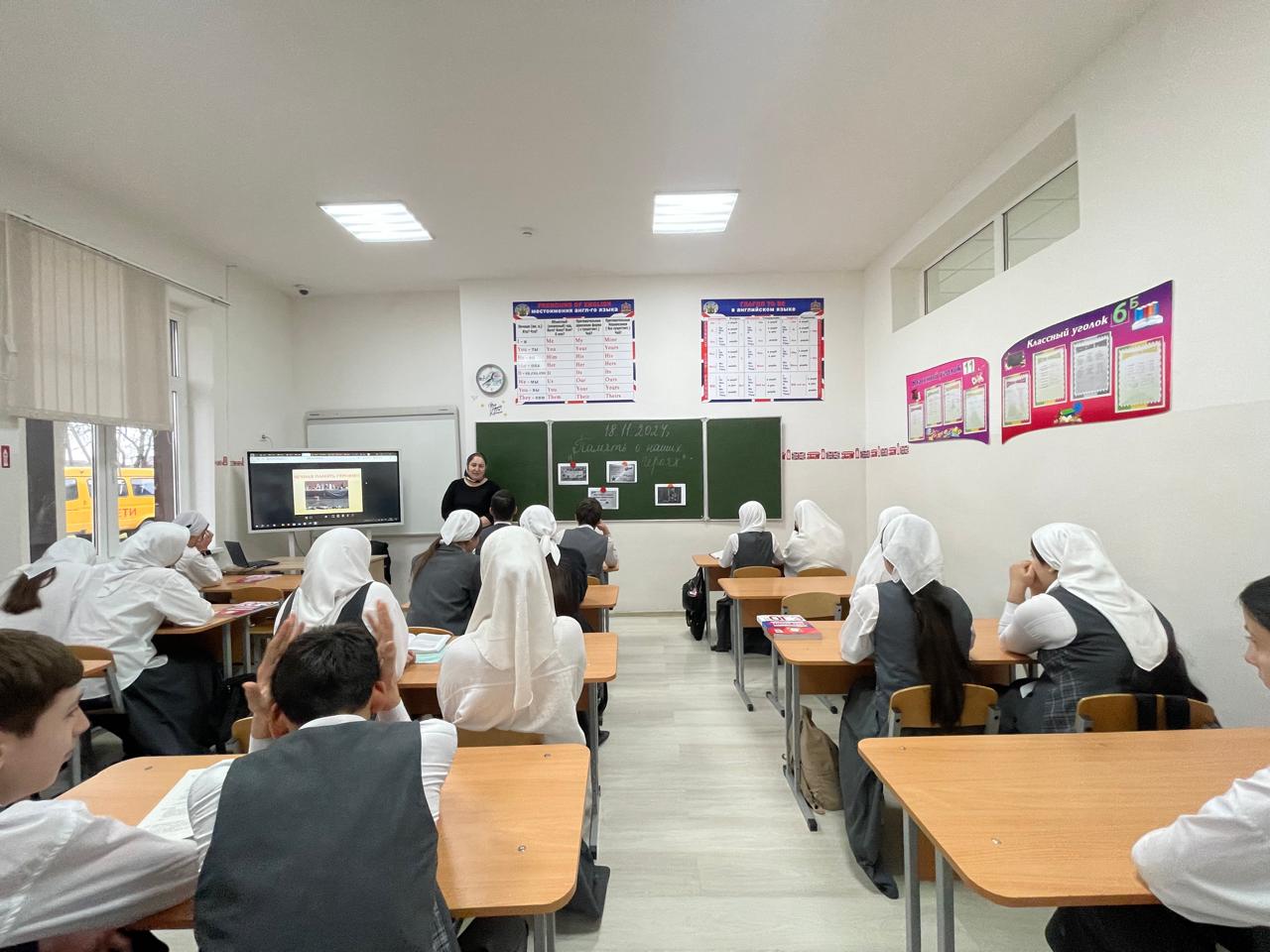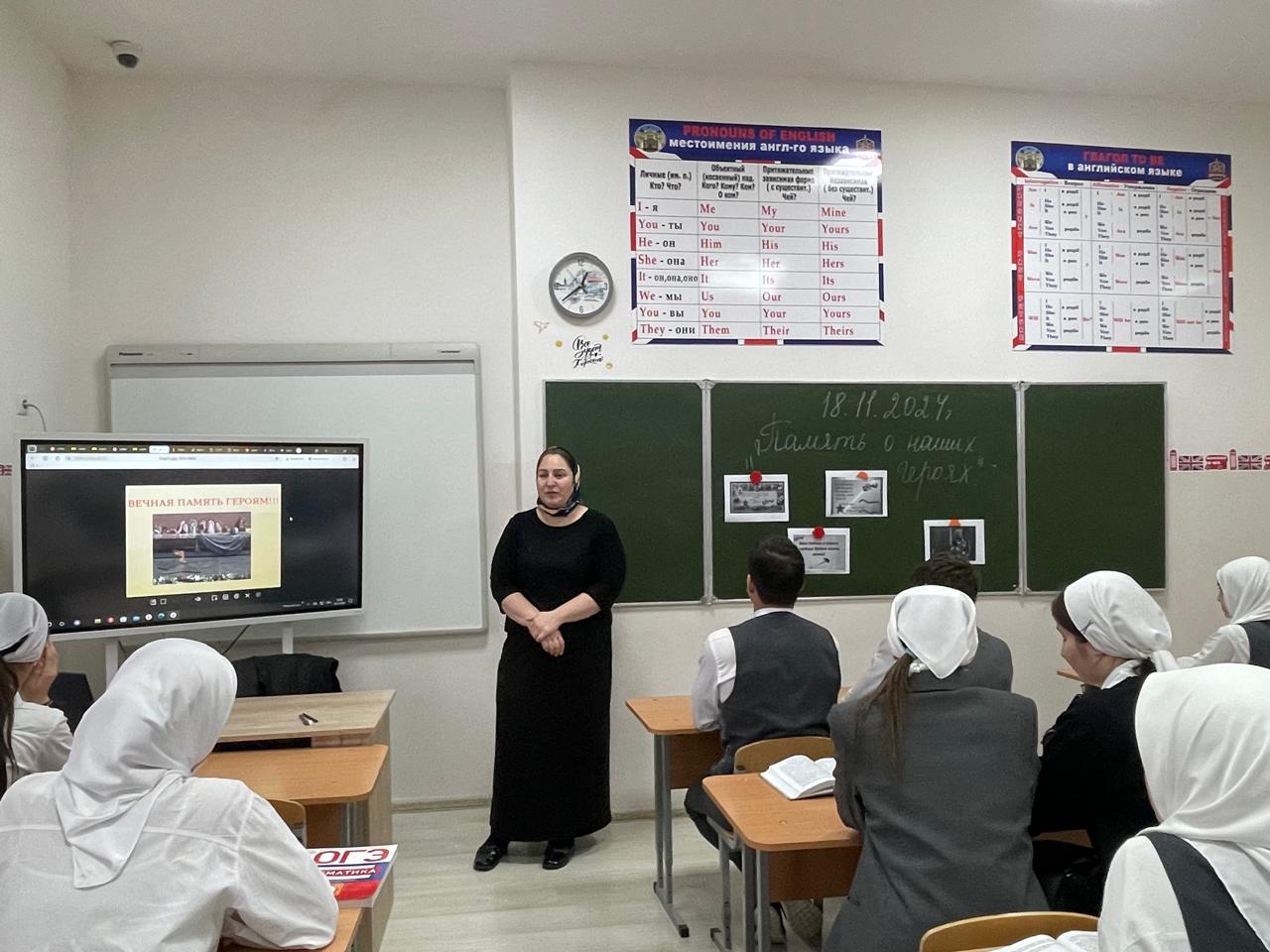 18.11.2024Учитель истории и обществознания Алиханова А.Л. провела информационный час : «Память о наших героях» в 9"Б" классе.