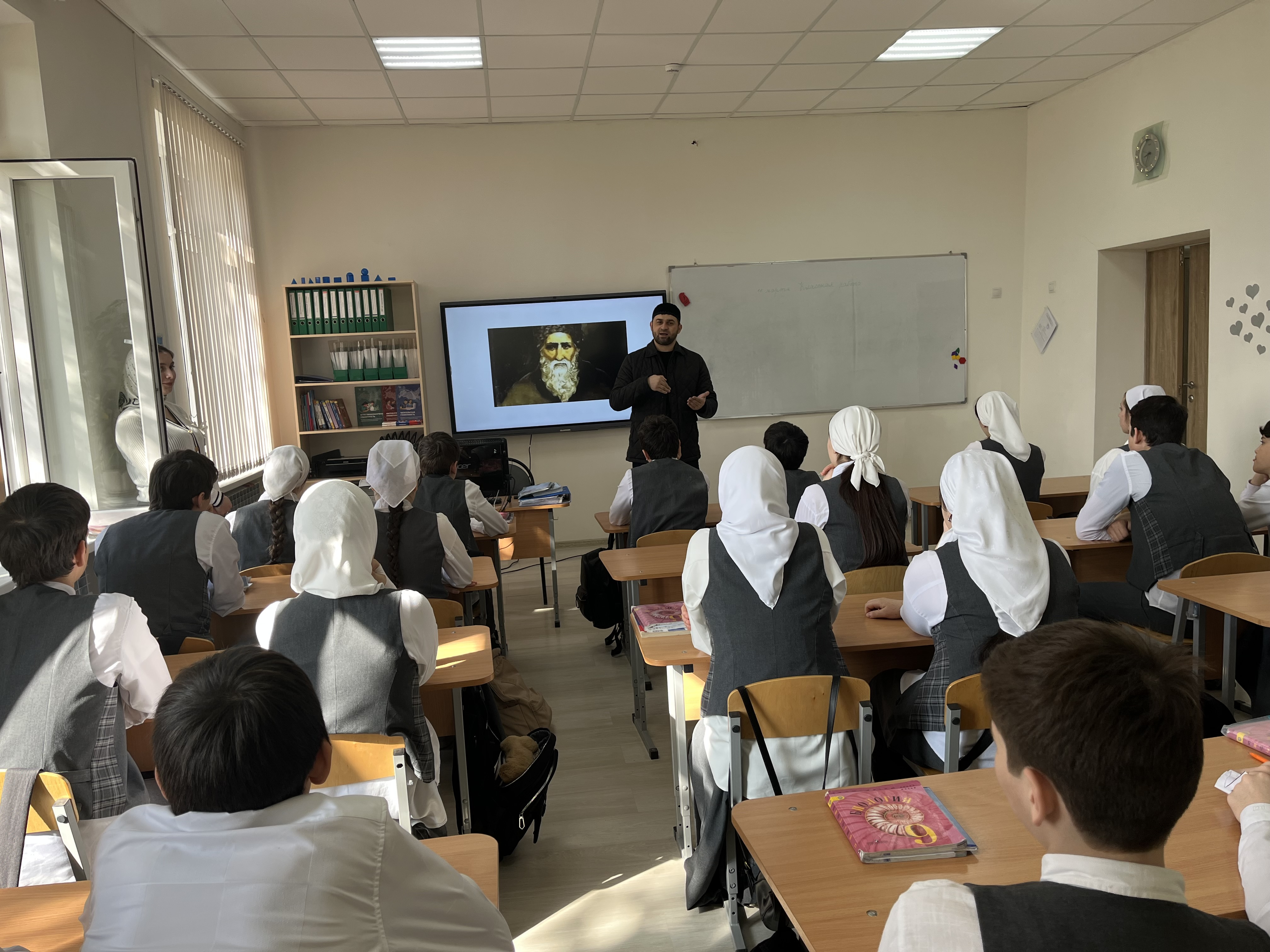 10.03.2025Цель беседы: ознакомить учащихся старших классов с героической личностью Байсангура Беноевского, рассказать о его роли в Кавказской войне и его вкладе в культуру чеченского народа. Педагог-организатор по ДНВ Ахмадов Ш.А. кратко рассказал биографию Байсангура Беноевского: детство, юность, участие в Кавказской войне, героизм и мужество, примеры подвигов и сражений.